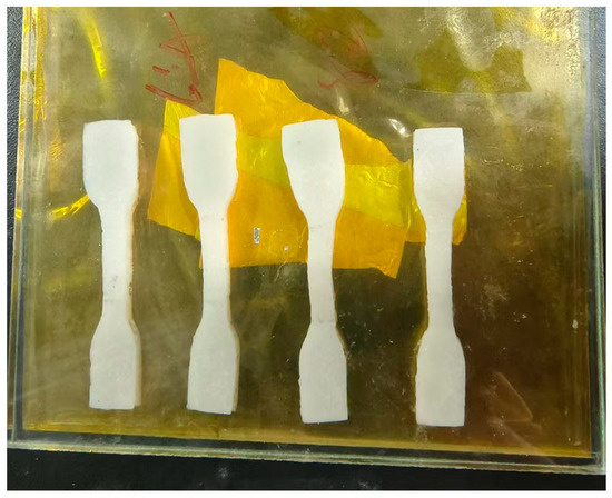The broken silicone rubber samples were aligned and taped at the fracture site, then clamped between two glass slides to ensure good contact. The samples were then healed at room temperature for 24 h and at 60 °C for an additional 24 h, totaling 48 h. The repaired fluoro-silicone rubber sample is shown in Figure 3.