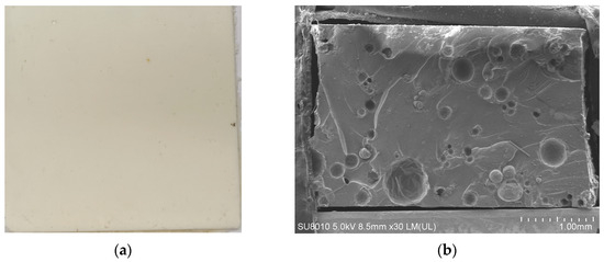 The self-healing fluoro-silicone rubber sample was obtained via demolding. The results of the prepared self-healing composites and the cross-section scanning electron microscopy are shown in Figure 4.