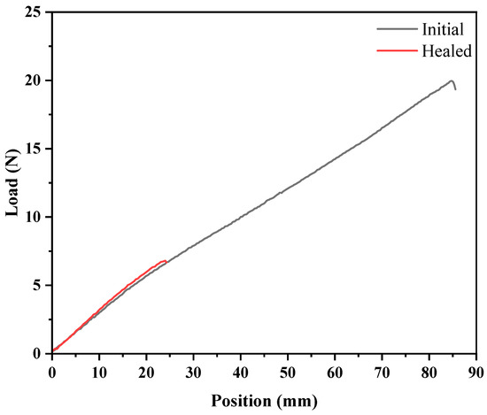 The typical stress–strain curves of self-healing materials before and after repair are shown in Figure 5.