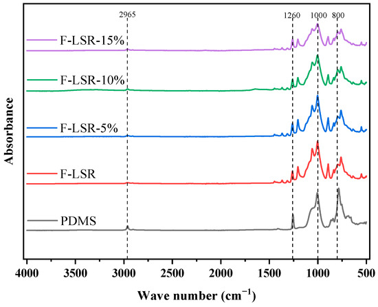 To analyze the comparison of the functional group composition of the fluoro-silicone rubber before and after the addition of microcapsules, a Nicolet iS50 Fourier Transform Infrared Spectrometer (Thermo Fisher Scientific, Waltham, MA, USA) was used to analyze the infrared spectra of the surface of the dumbbell-shaped samples.