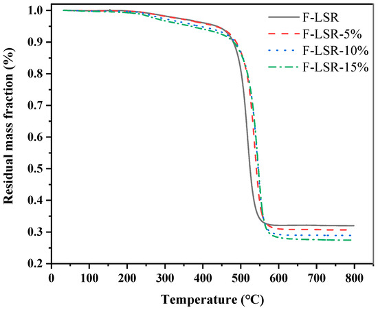 Due to the high bonding energy of the Si-O bond, the thermal stability of siloxane materials is generally good. The pure fluoro-silicone rubber material used in this test showed an obvious thermogravimetric loss in the range of 400 °C~550 °C. Its initial thermal decomposition temperature was about 437 °C, and the residual quality after decomposition was high. In contrast, the initial thermal decomposition temperature of the microcapsules was low, and the residual mass after core material decomposition was also low, so the initial thermal decomposition temperature and residual mass of the composite materials were decreased. According to the thermal decomposition curve, the introduction of the microcapsules did not lead to a new weight loss peak of the composite material, and the maximum weight loss rate increased slightly. The maximum thermal weight loss rate of the samples added with microcapsules all appeared in the temperature range of 535 °C~545 °C.
