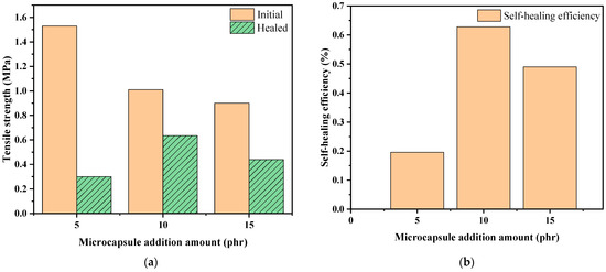 The effects of the microcapsule amount on the self-healing properties were studied. The addition ratio of the two-component microcapsules was fixed at 4:6, and the amount of microcapsule was adjusted to 5 phr–15 phr. The tensile properties and self-healing properties of the samples were tested. The results are shown in Figure 8.