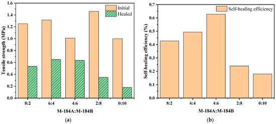 The effects of the microcapsule addition ratio on the self-healing performance were studied. The dosage of fixed microcapsule was 10 phr, and the addition ratio of the two-component microcapsule was adjusted to be 8:2~0:10 (M-184A:M-184B). The tensile properties and self-healing properties of the samples were tested, and the results are shown in Figure 9.