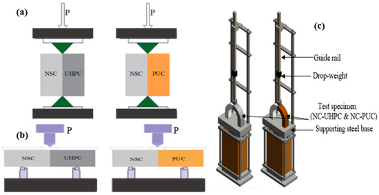 Experimental setup: (a) splitting tensile, (b) flexural, and (c) impact tests.