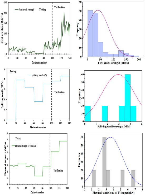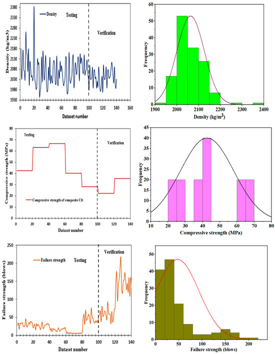 The data distribution was used to evaluate the datasets and characterize their nature, comprising six (6) variables obtained from the static and drop-weight impact testing. The variation and distribution plot of each input variable and output parameter is shown in Figure 2, showing that some of the input variables nearly followed normal distribution, including first crack strength (N1) and failure strength (N2), while input variable density (ρ) was normally distributed. On the other hand, parameters including splitting tensile (ft) and compressive strength of the composite (Cfc), and flexural strength of the U-shaped specimen under static load barely followed normal distribution.