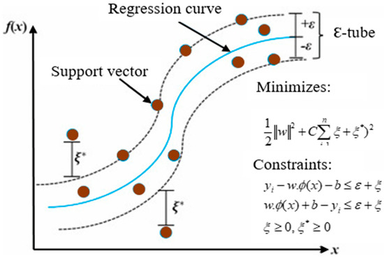SVR is an adaptation of the SVM model originally designed for classification tasks, now tailored for regression analysis. It constructs a plane or hyperplane, aiming at minimizing the sample’s overall deviation from the hyperplane. Its primary goal is to reduce the error by developing a regression function that maximizes the fit between data points and a curve [55]. Figure 5 presents the architecture of SVR. The process is explained as a constrained optimization issue, as expressed [56]: