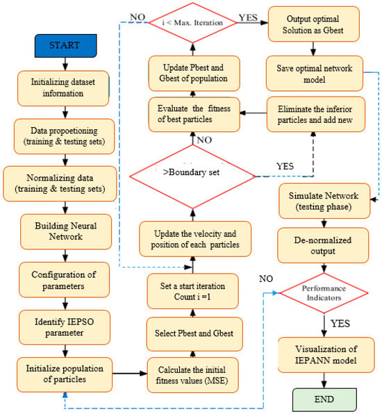 After the sensitivity analysis where the parameters’ relevance was evaluated, the dataset was grouped into 70% and 30% for training and verification. The data were also normalized between 0 and 1 to prevent data with greater values from overriding those with lower values, as recommended [59]. MATLAB 2021 was used in this study to train the three machine learning models (IEPANN, SVR, and GPR). IEPANN is a hybrid model that was formed by employing IEPSO to optimize ANN models. Training the IEPANN model involved two stages (see Figure 6). The first stage involved developing an ANN model, and in the second stage, IEPSO was used to optimize the ANN technique’s weights and bias. Correct model structure is essential for developing any machine learning technique like an ANN model. For developing the ANN model, several model structures were developed, and the structure with five input parameters, seven hidden neurons, and a single output layer trained with the Levenberg–Marquardt algorithm was found to be the optimum model structure with the least mean square error and lowest R2 value. The optimum result was obtained using Sigmoid and Purlin functions, respectively, in the hidden and output layers of the ANN model. After obtaining the optimum ANN structure, the model was used to optimize the weight and bias of the ANN models during the iteration process. The population size, inertia weight, and the stopping criteria for the IEPSO were enhanced in the ANN. The IEPSO parameters optimized include swamp size, inertia weight, and termination criteria. The inertia weight was ω = 0.729, and its damping ratio was 1, while the lower and upper bound velocities were −5 and 5, respectively, obtained using Equation (14) [60]. A trial-and-error procedure was employed with a population size of 50–500 with an increment of 50. The model concert increases by changing the positions of the particle while the MSE reduces a little at each iteration: