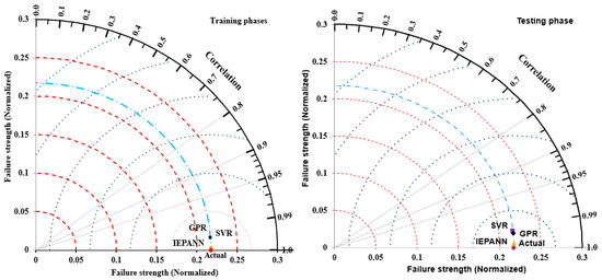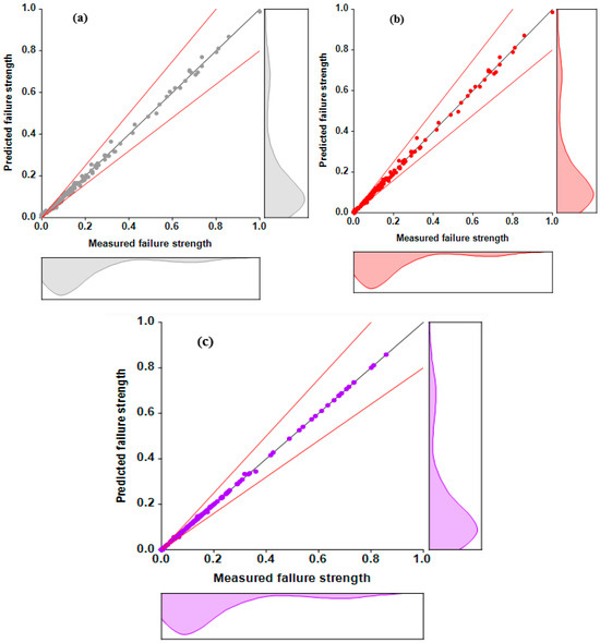 The RMSE, standard deviation, and correlation coefficients of the experimental data and the three developed machine learning models are compared graphically in Figure 9, using Taylor plots. All the models had correlation coefficients > 0.99. The standard deviations of the models were almost similar to that of the data, eliminating the overfitting issues in the models [67]. The RMSE values were also less than 0.05 (normalized), indicating a high level of accuracy for the models in predicting failure strength.
