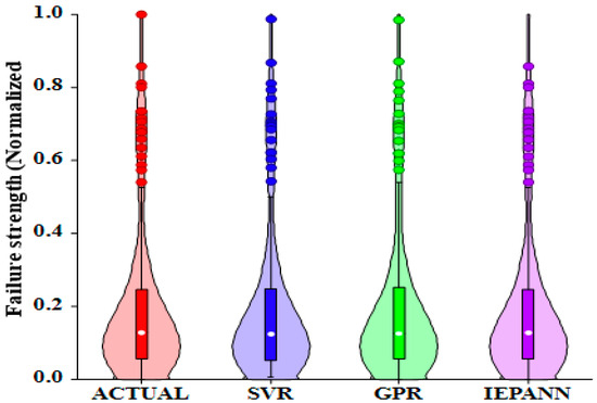 From the results, it can be noted that all the models predicted the failure strength with excellent results, with NSE > 0.75, PBIAS, and normalized error metrics (MAE and RMSE) close to zero. The IEPANN outperformed the classical models, with an NSE value of 99.99% in the training and 99.96% in the verification phase. The IEPANN similarly indicated its superiority over SVR and GPR in terms of MAE, RMSE, and PBIAS values. The IEPANN modelled the failure strength with RMSE, MAE, and PBIAS values of 0.0025, 0.0009, and 0.0095 respectively, in the verification stage. The normalized RMSE, MAE and PBIAS values of the IEPANN model were (0.0076, 0.0056, and 0.0610) and (0.0053, 0.0041, 0.0041) lower compared with the SVR and GPR models, respectively. The IEPANN also demonstrated better stability, with as little as 0.03% difference between the NSE values in the training and verification stages. Several studies have reported improved ANN performance when PSO was used to optimize ANN parameters [62]. The IEPANN derives its superiority by analytically optimizing the ANN parameters (bias and weights) using the IEPSO algorithm by updating the particles’ position. Scatter plots (Figure 7) showing the models’ goodness of fit were also used to compare the performance of the IEPANN model with the single classical models (SVR and GPR). It can be seen that the data are more compacted along the chart bisector in Figure 7c, indicating better agreement between the observed and predicted failure strength for the IEPANN technique. All the models were also compared using a violin plot (Figure 8) including boxplots, interquartile ranges, and distribution plots. All the models mimicked the experimental data well, indicating the models’ suitability for predicting failure strength. The findings for the developed models were compared with results found in the literature for small datasets utilized with AI-based models, as summarized in Table 4; those models predicted the concrete’s properties with high R2 values [63,64,65,66].
