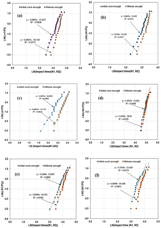 Weibull distribution analysis of impact data for (a) reference NC, (b) NCNF-UHPC, (c) NCGS-UHPC, (d) NCNS-PUPC, (e) NCGS-PUPC, and (f) NCSS-PUPC.