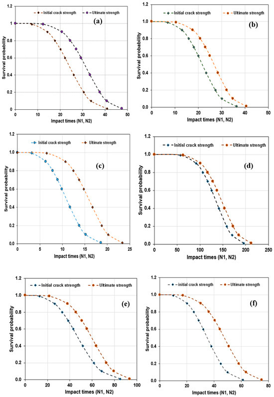 Reliability analysis of impact data for (a) reference NC, (b) NCNB-UHPC, (c) NCGB-UHPC, (d) NCNB-PUPC, (e) NCGB-PUPC, and (f) NCSM-PUPC.