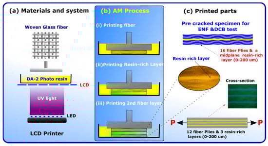 Idrees et al. [10] focused on a different aspect of fiber-reinforced composites, with the stiffness being a secondary consideration to the overall composite strength; the method of strengthening investigated is called “resin-rich layers”, wherein layers without reinforcement are added in attempt to obtain the strength of the reinforcement without the increased brittle behavior found in higher fiber volume composites, causing a reduction in strength. During this experiment, fiber layers were made by adding wetted mats of fiberglass (displayed in Figure 2) into the vat of a digital light processing (DLP) bottom-up resin printer with unreinforced layers added to control the fiber content with exclusively resin layers between mats in an attempt to preserve plastic behaviors between reinforcement. Tensile (ASTM D3039), flexural (ASTM D7264), shear (ASTM D2344), and interlaminar fracture toughness (ASTM D5528, ASTM D7905) samples were fabricated and post-processed using a curing cycle, followed by polishing to remove any protruding fibers from the composite.