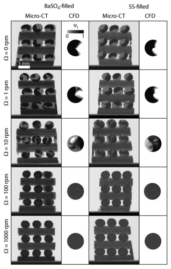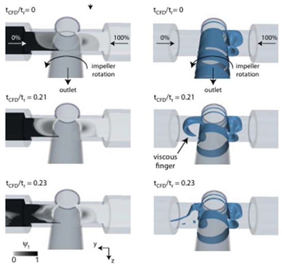 Mixing requirements are explored by Ortega et al. [12], with the utilization of inks highly filled with BaSO4 or stainless steel (SS) particles being mixed into an unfilled ink during deposition shown in Figure 3. Cylindrical or grooved impellers described in Figure 4 are utilized for printing samples which are cut and imaged perpendicular to the extrusion path, with the fraction of mixing determined based on the percentage that is darkened with filler, as shown below.