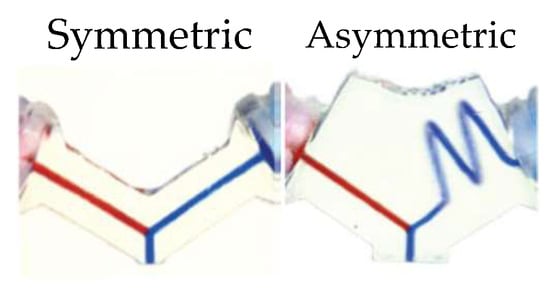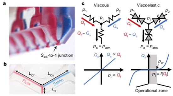 The gating of material is studied by Scott et al. [13] for the switching of deposited resins through the same nozzle without mixing. The group printed transparent nozzles which are supplied through a path from each resin supply; this was observed for backflow and mixing of the active fluid into the static fluid supply. A model for Herschel–Bulkley fluids was developed for calculating maximum flow rates based on the path geometries described in Figure 5 and the resin rheology; from this, the asymmetric resin paths shown in Figure 6 were made, increasing the length of the path for thinner resins so that the resins would have similar flow rates.