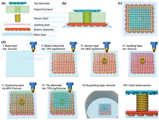 Diagram of process utilizing direct ink writing to build a tactile sensor with different inks. (a) Exploded view of each layer. (b) Diagram showing assembled layers. (c) Top view of assembled layers. (d) Progression through each layer deposition [46].