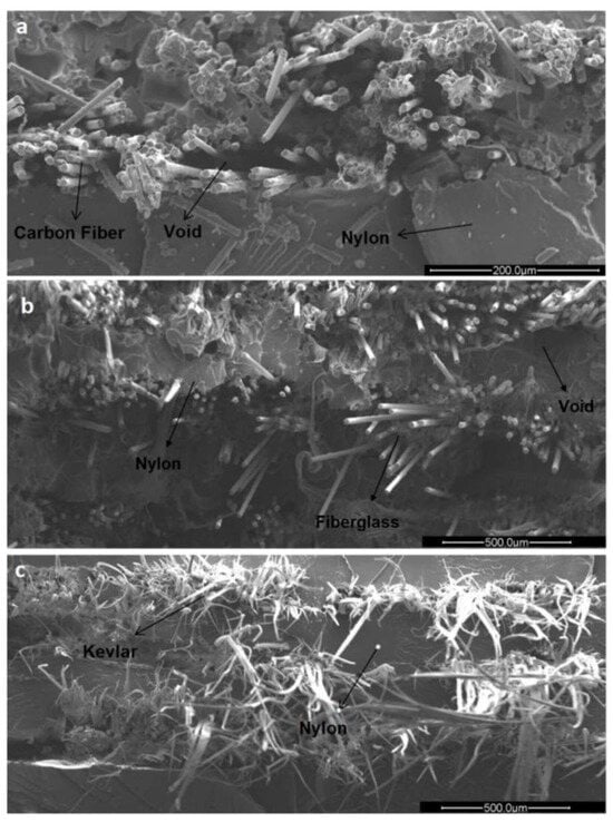 SEM images of sample fracture, with fiber pullout displayed. (a) Carbon fiber sample SEM. (b) Fiber-glass sample SEM. (c) Kevlar sample SEM [2].