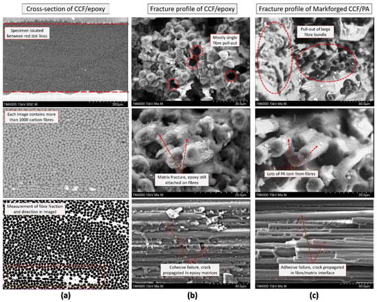 (a) SEM cross-sectional images of CF-reinforced resin; (b) SEM of fracture displaying voids from fiber pullout in CCF/Epoxy. (c) SEM of fracture displaying voids from fiber pull-out in CCF/PA [4].