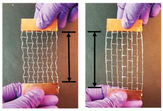 An ionogel that demonstrates rheological properties conducive to direct ink wringing was developed by Wong et al. [44]. The tensile properties were demonstrated in addition to experiments finding that crosslinking in the curing method reduced conductivity by a third, which was noted as still being sufficient for the production of sensors. The change in resistivity was found to be consistent and predictable. The authors proceeded to demonstrate a sensor made by networking this material to be damage-tolerant due to the many conductive pathways shown in Figure 11, which is not a quality typically found in stretching sensors.