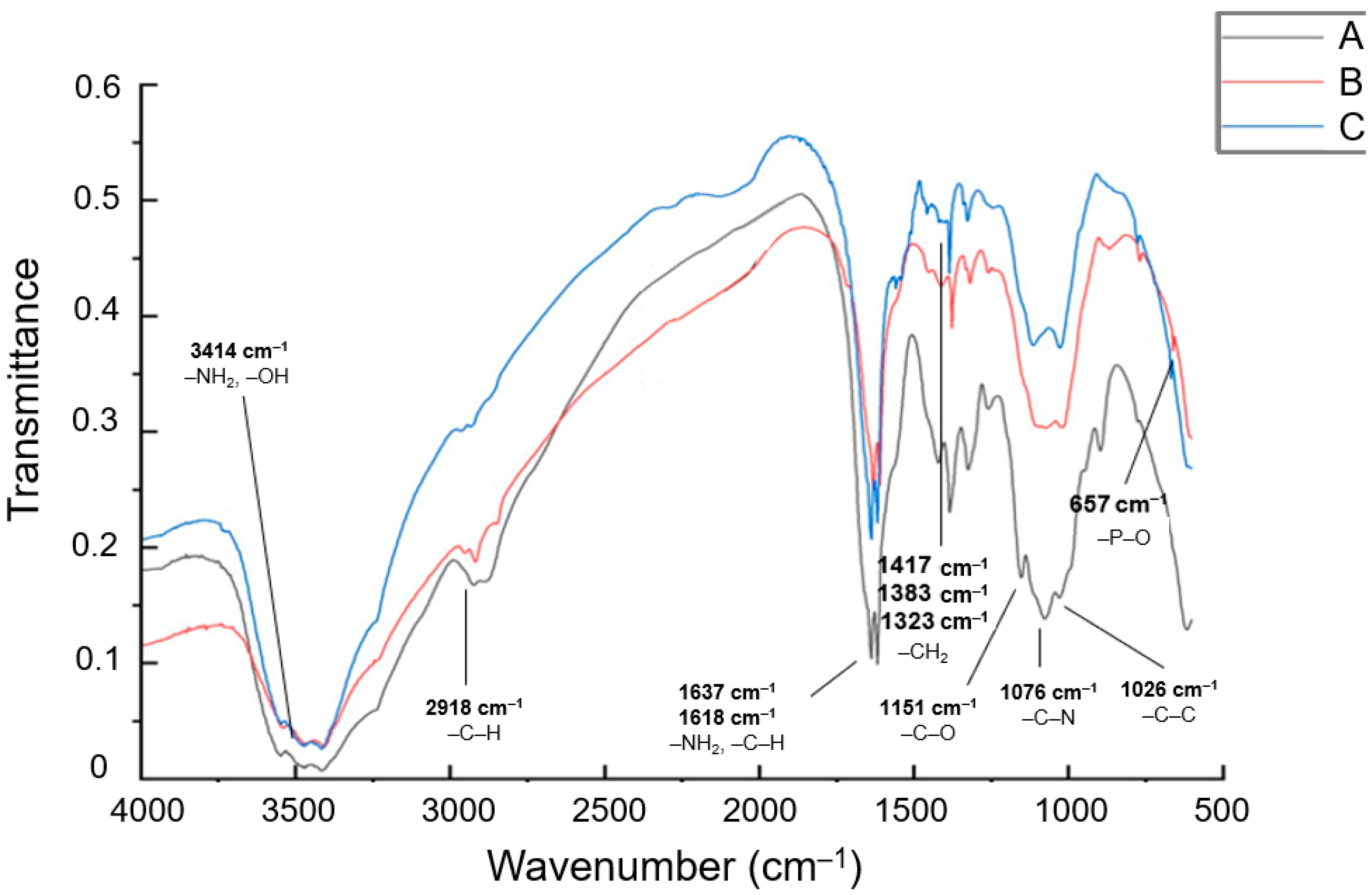 3.1. IR Spectroscopy Analysis of Particle Structure