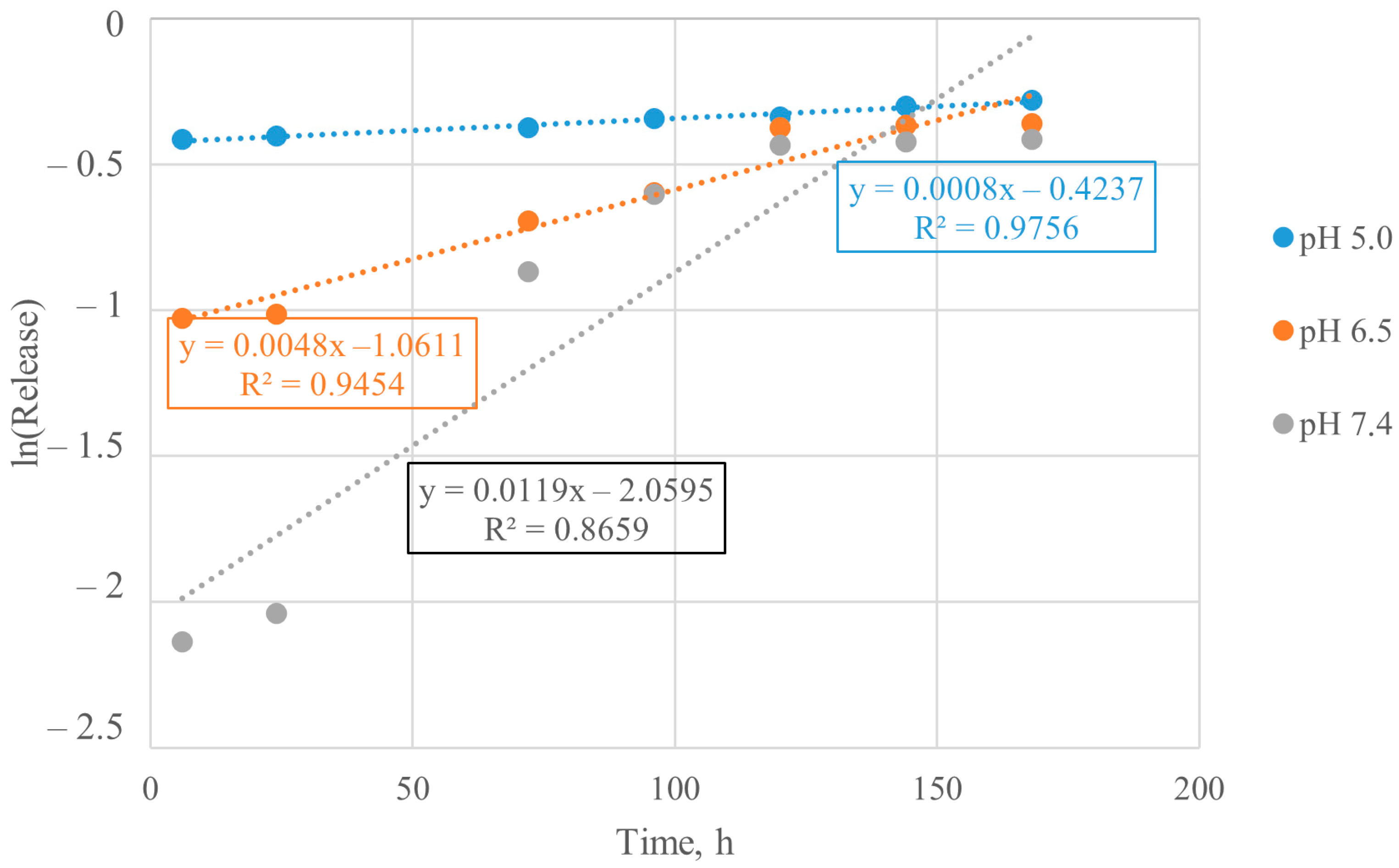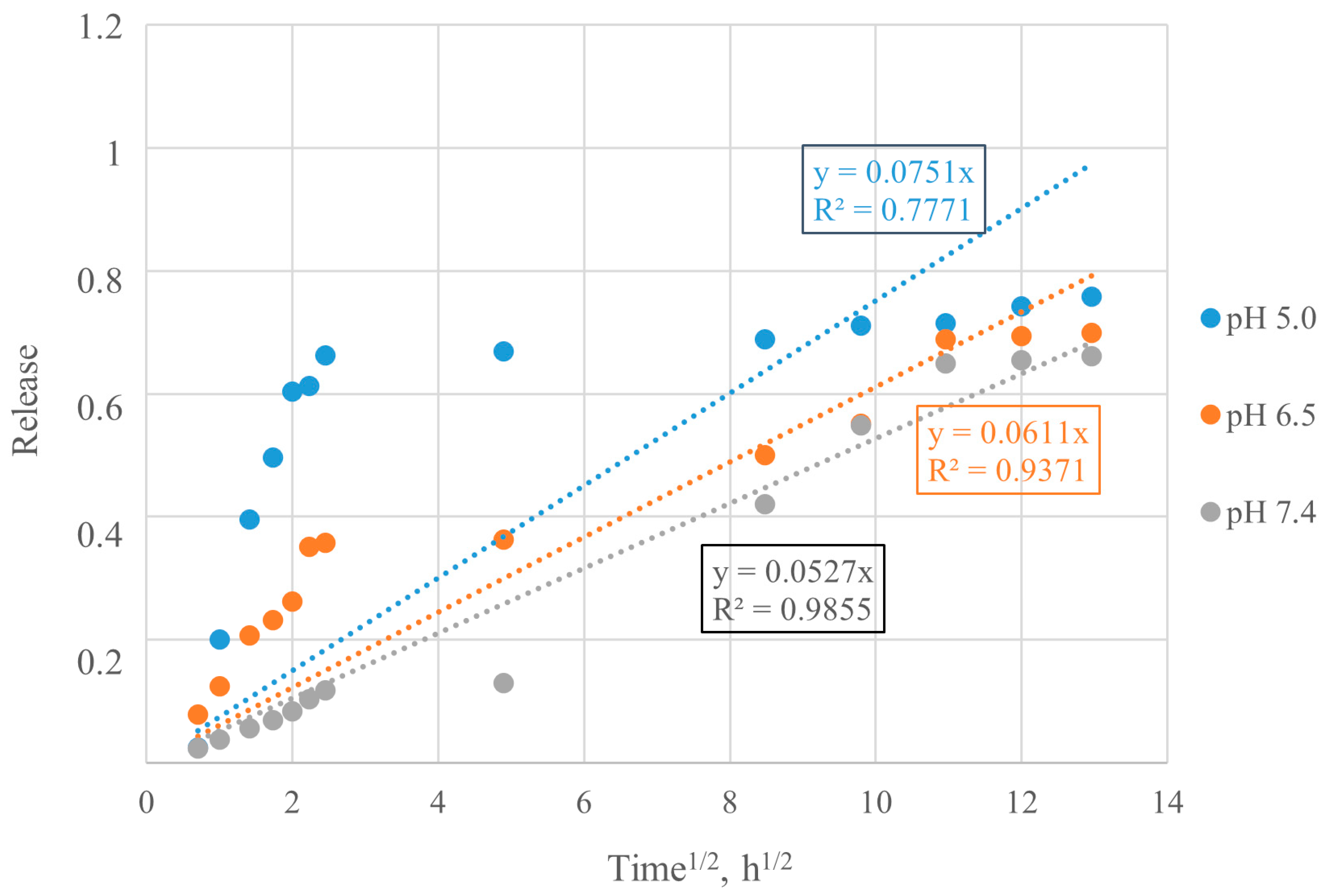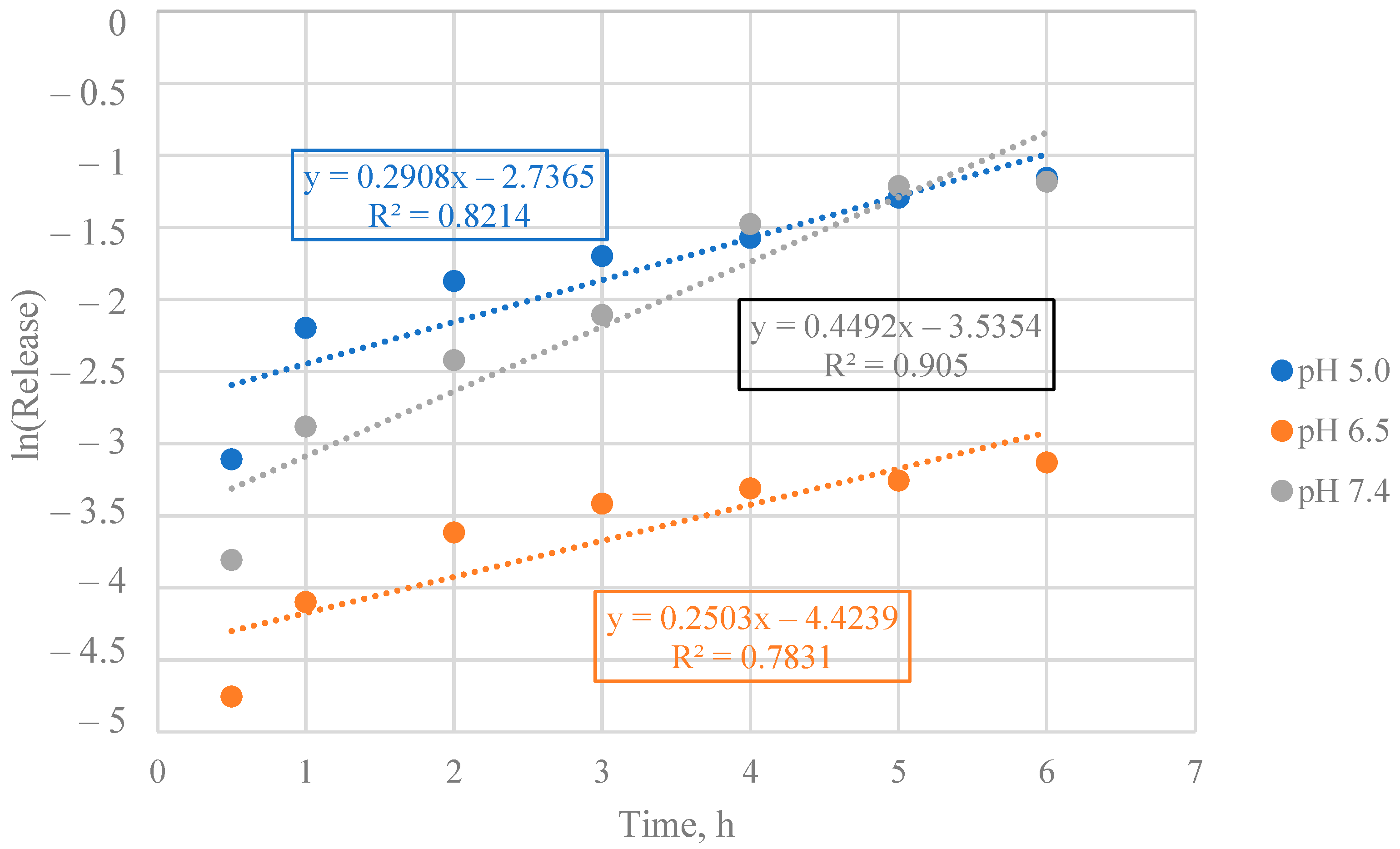 3.5. Calculation of Kinetic Parameters of BSA Release from Particles