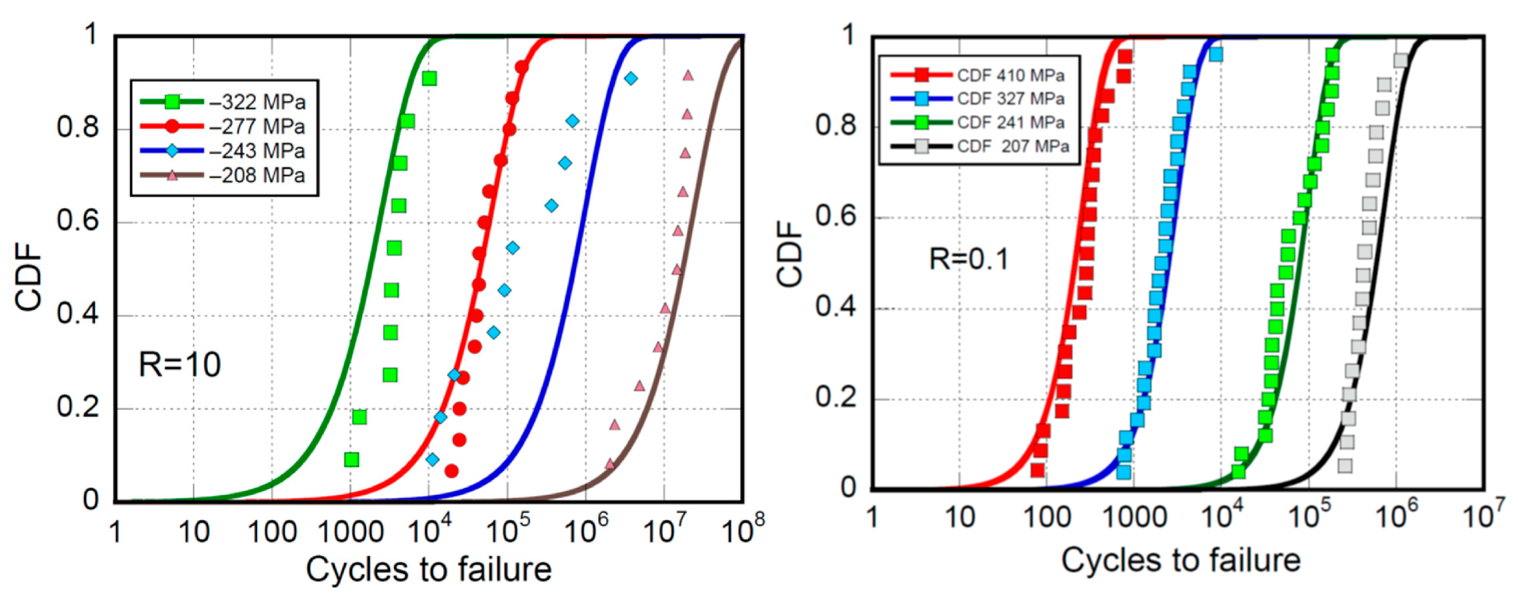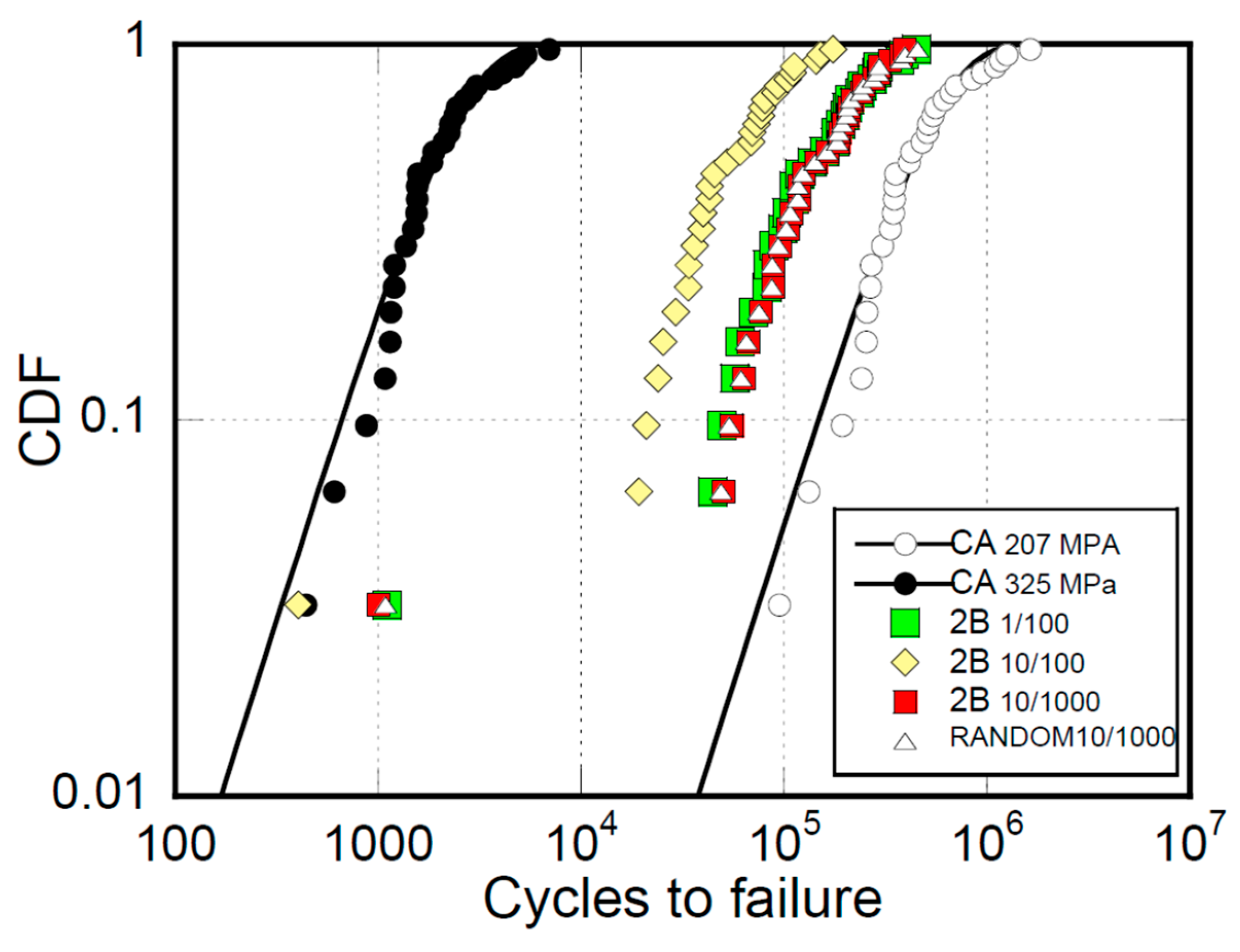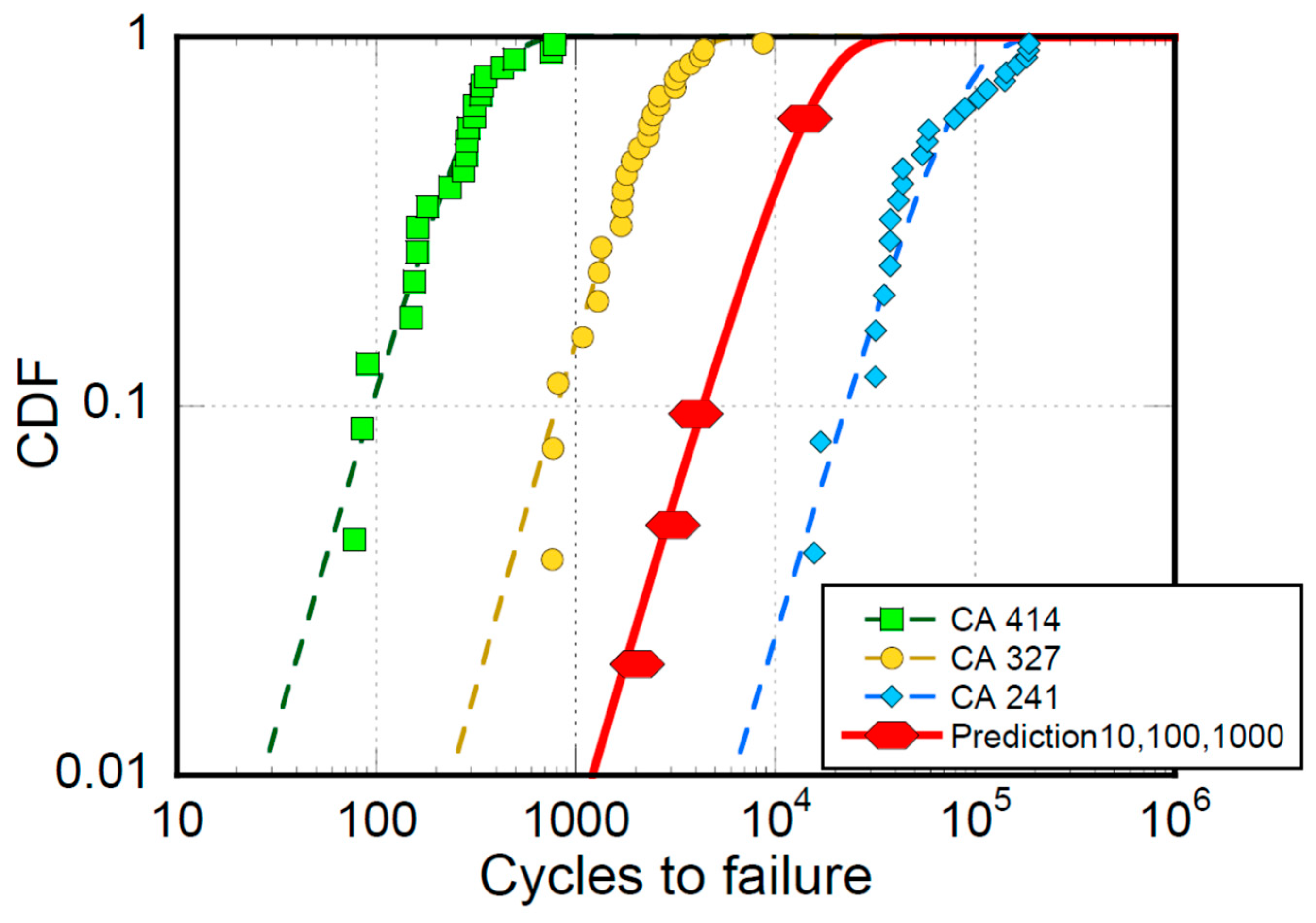 - The CA fatigue life cumulative distribution function (CDF) as a function of the applied maximum stress;