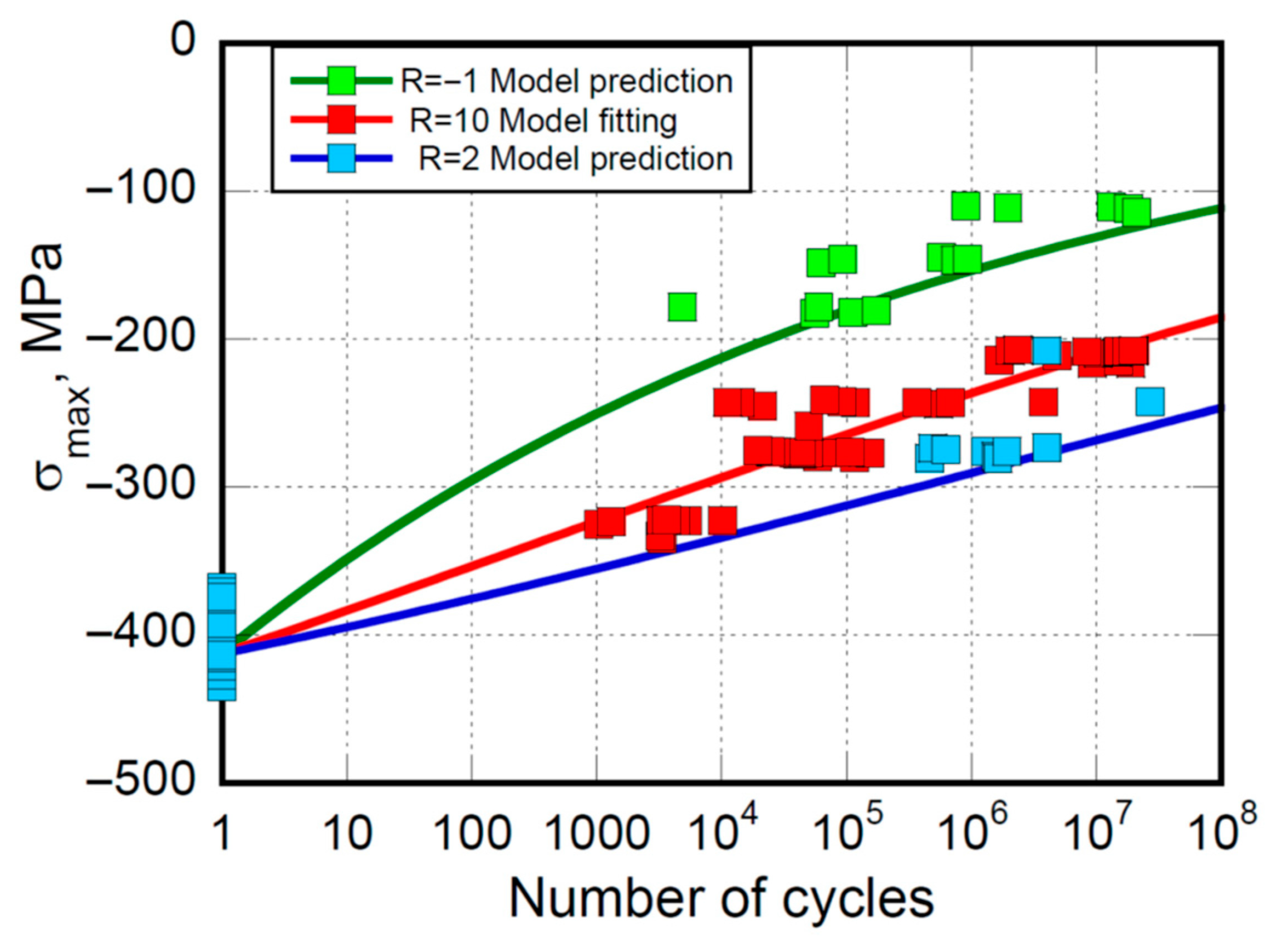 - Boerstra, G.K. The multislope model: A new description for the fatigue strength of glass reinforced plastic. Int. J. Fatigue 2007, 29, 1571–1576. [Google Scholar] [CrossRef]