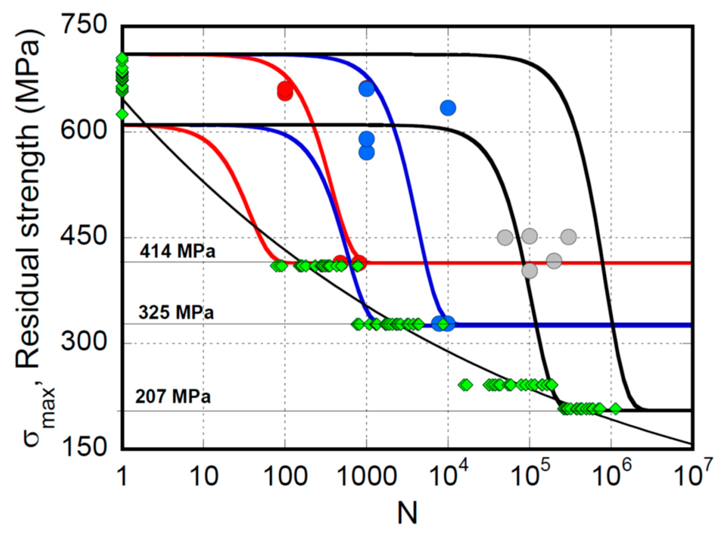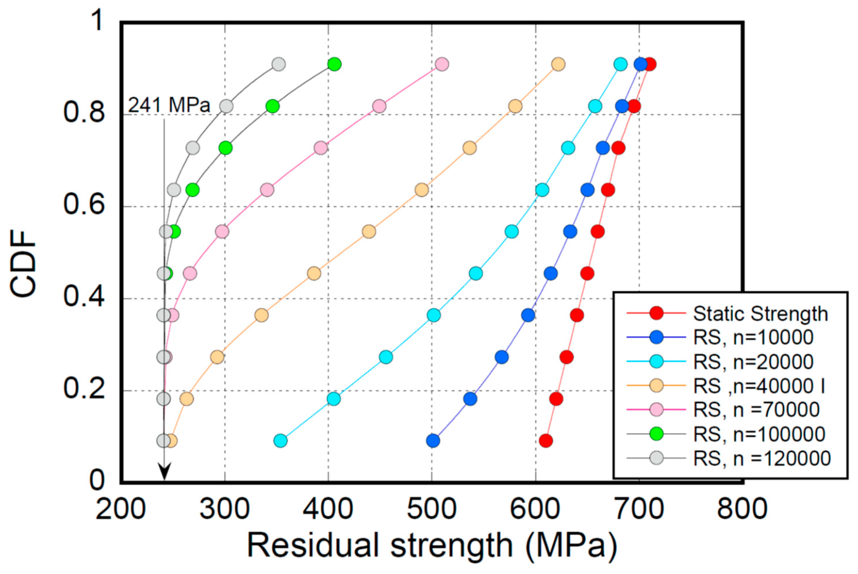 - Chou, P.C.; Croman, R. Residual strength in fatigue based on the strength-life equal rank assumption. J. Compos. Mater. 1978, 12, 177–194. [Google Scholar] [CrossRef]