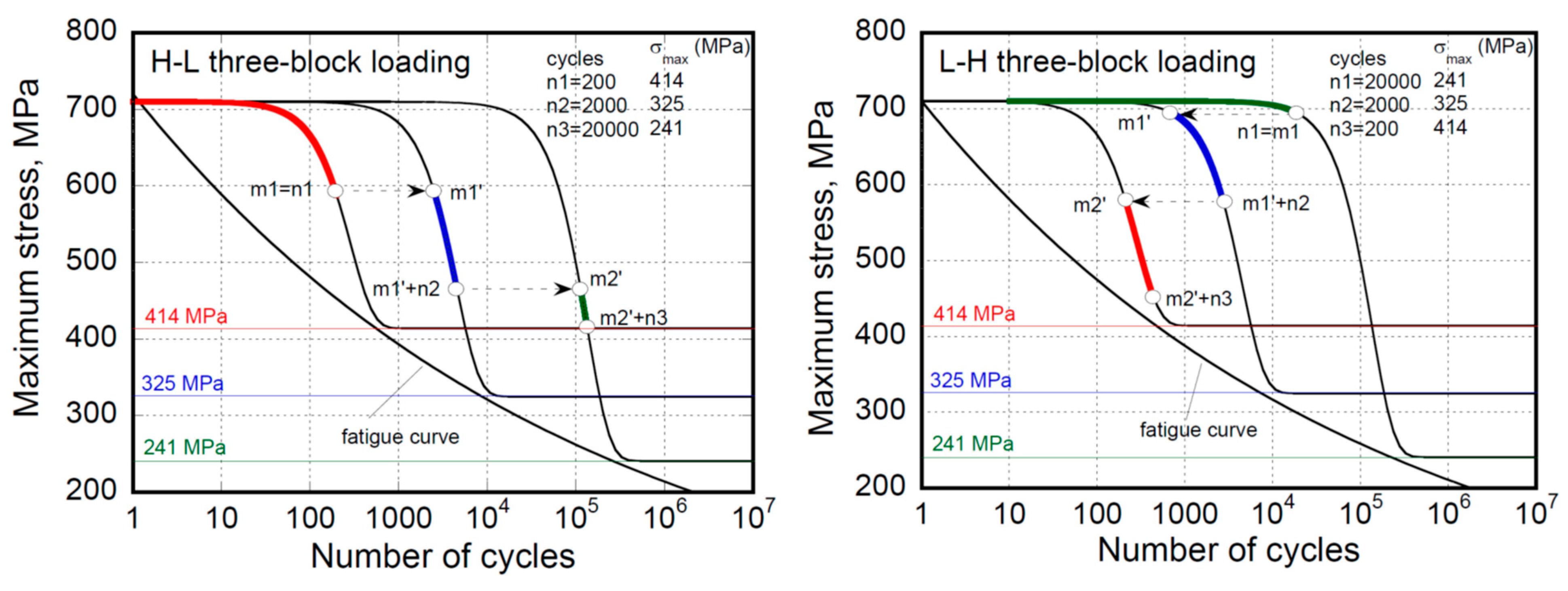 - Yang, J.N.; Jones, D.L. Load sequence effects on the fatigue of unnotched composite materials. In Fatigue of Fibrous Composite Materials; Lauraitis, K.N., Ed.; ASTM International: West Conshohocken, PA, USA, 1981; pp. 213–232. [Google Scholar] [CrossRef]