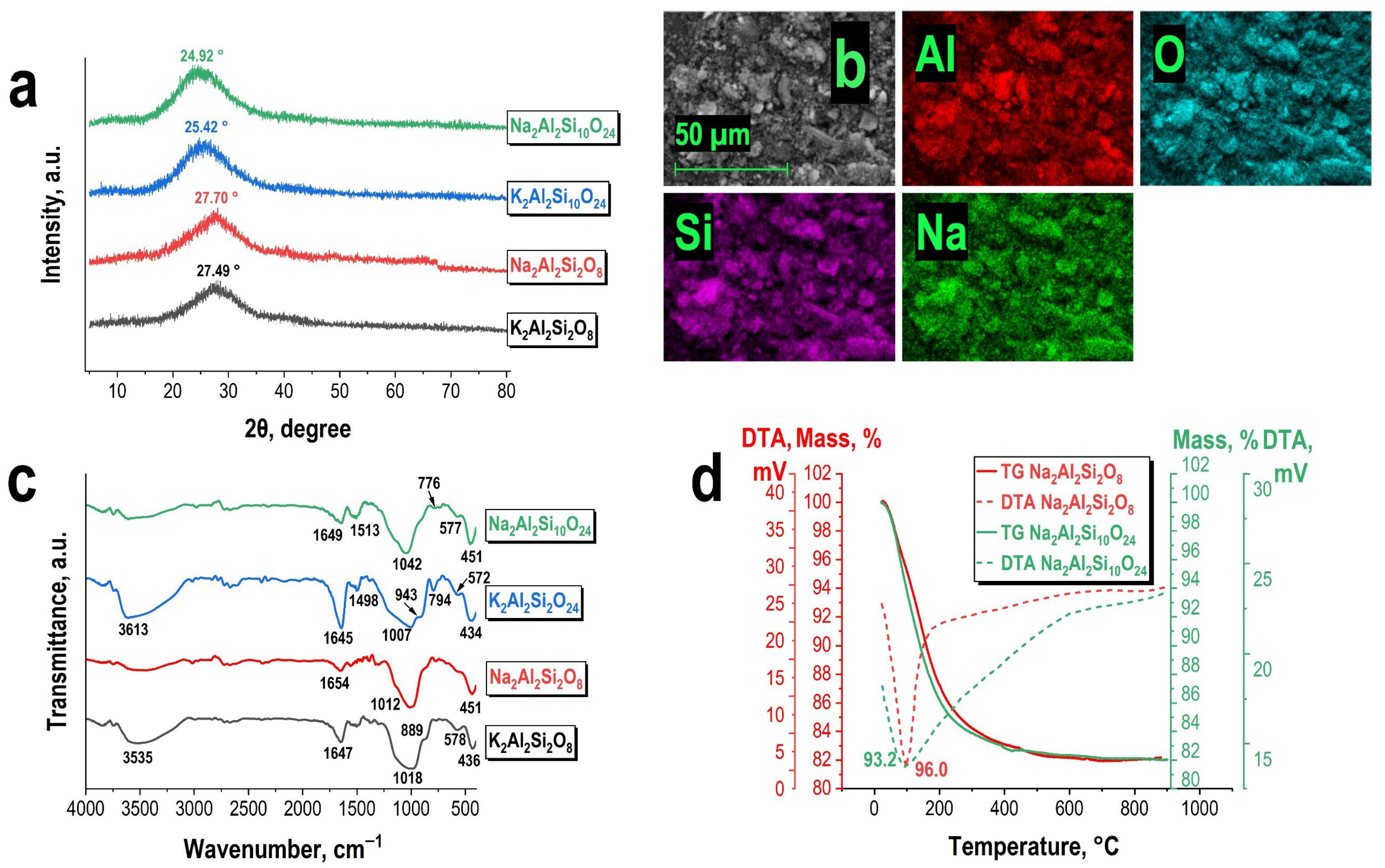 - Mozgawa, W.; Fojud, Z.; Handke, M.; Jurga, S. MAS NMR and FTIR Spectra of Framework Aluminosilicates. J. Mol. Struct. 2002, 614, 281–287. [Google Scholar] [CrossRef]