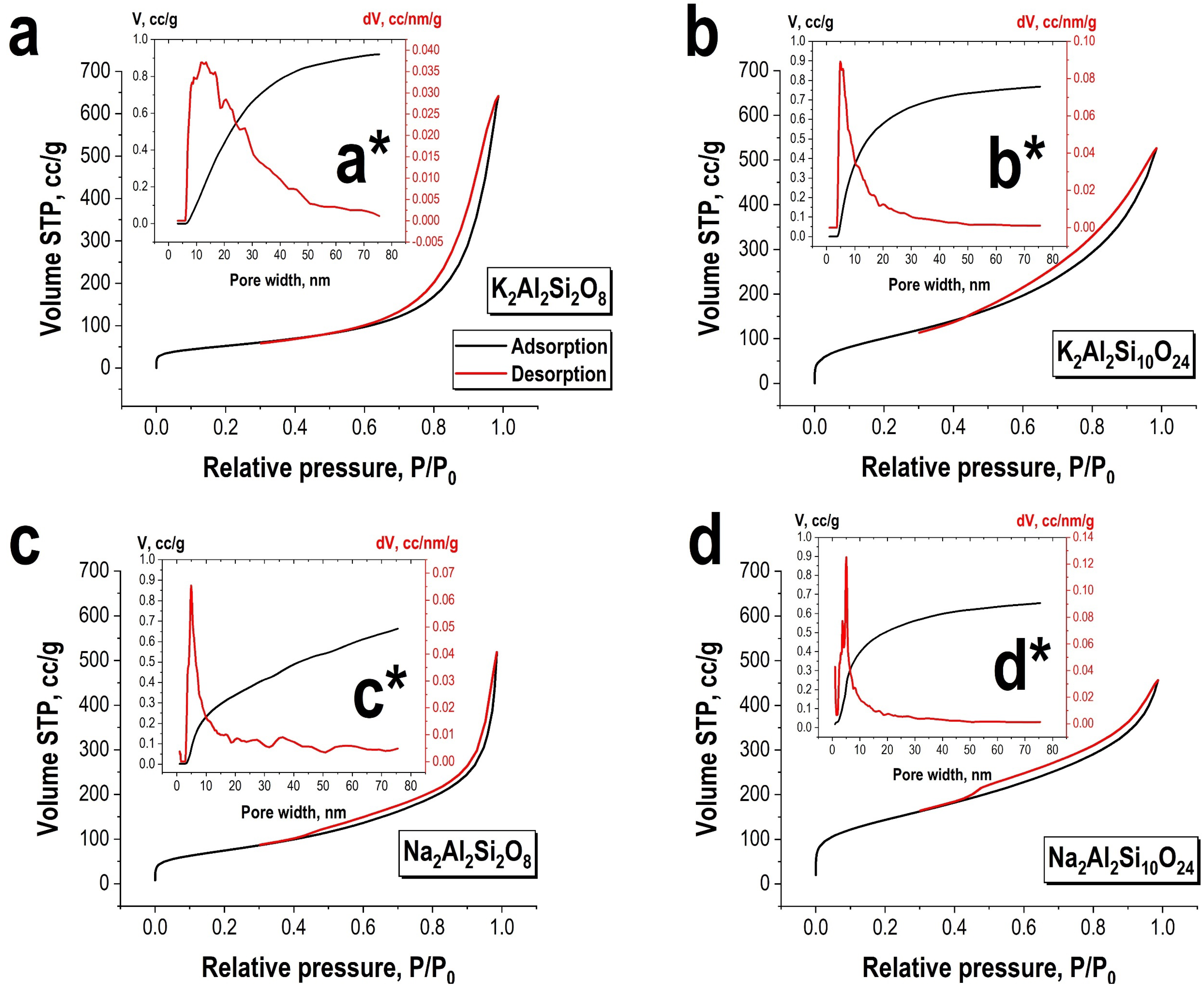 - Thommes, M.; Kaneko, K.; Neimark, A.V.; Olivier, J.P.; Rodriguez-Reinoso, F.; Rouquerol, J.; Sing, K.S.W. Physisorption of Gases, with Special Reference to the Evaluation of Surface Area and Pore Size Distribution (IUPAC Technical Report). Pure Appl. Chem. 2015, 87, 1051–1069. [Google Scholar] [CrossRef]