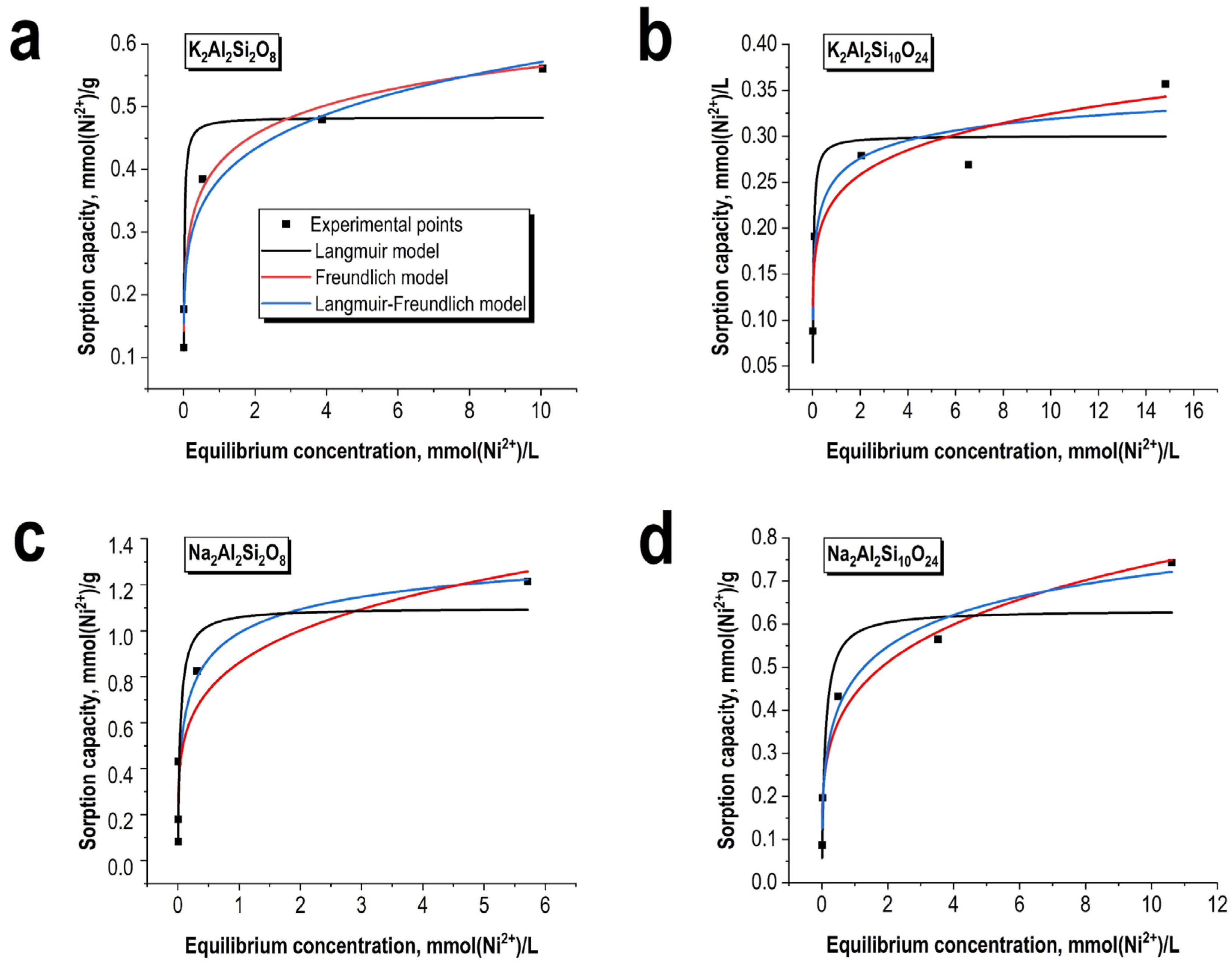 Langmuir-Freundlich | Qlmax, mmol/g | 1.00 ± 0.56 | 0.44 ± 0.11 | 1.52 ± 0.90 | 1.13 ± 0.60 |