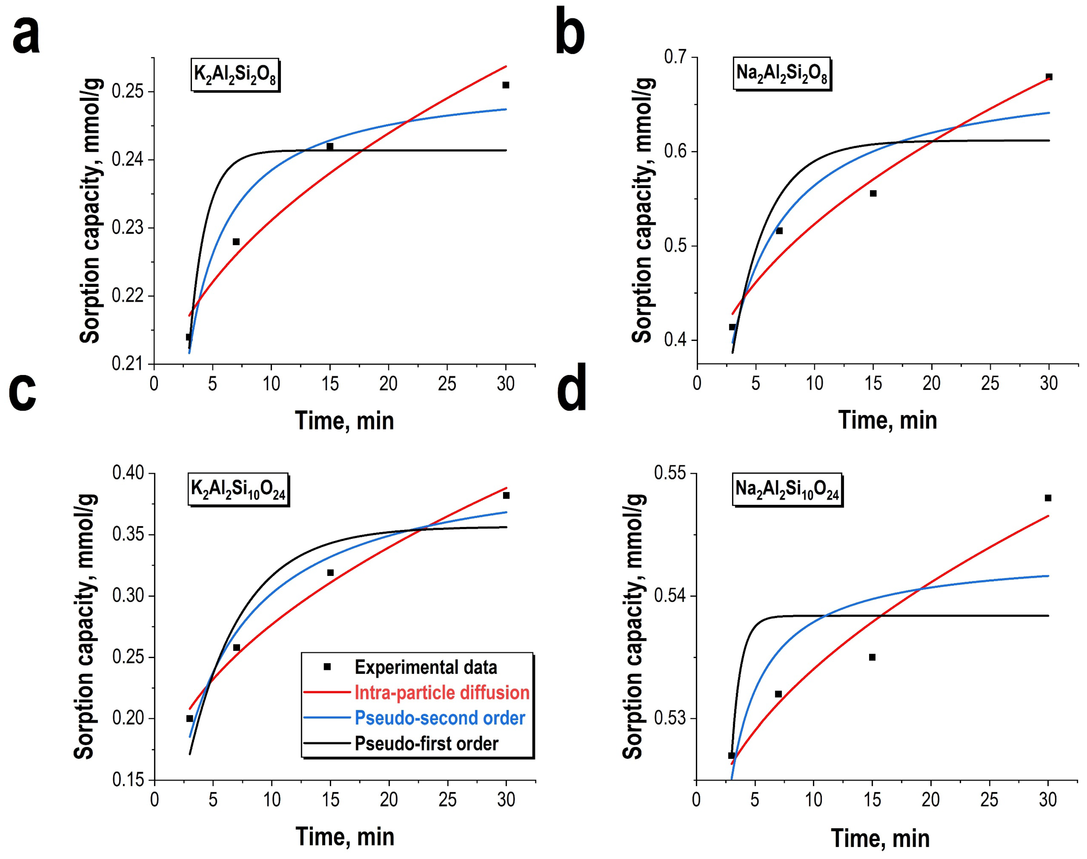 Morris-Webber intra-particle diffusion | K, mmol (g·min½) | 0.0098 ± 0.0015 | 0.048 ± 0.004 | 0.067 ± 0.008 | 0.0054 ± 0.0008 |