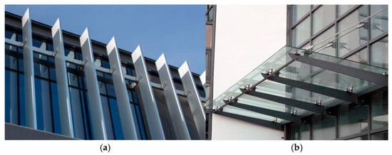 Structural solutions of the facades: (a) sun protection structure “fins”; (b) suspended sheds.
