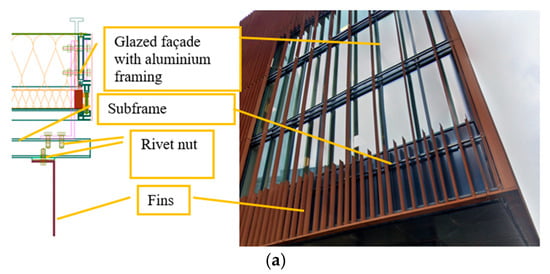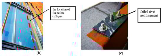 The failure of rivet nuts can lead to partial detachment of the suspended façade due to the disintegration of individual members. Figure 3 features sun protection elements (fins) on the façade (Figure 3a). This was the intention of the client and the architect and, as mentioned above, such a solution protects the envelope and interior spaces from direct sunlight and subsequent heating. To facilitate the installation of these fins around the building, a substructure was constructed on brackets fixed to the glazed façade of the aluminium frame, to which the fins themselves are then attached. While the substructure is visible from both outside and inside through the glazed part of the façade, the connection between the substructure and the fins was made using rivet nuts to enhance aesthetics and facilitate assembly. Figure 3a shows the structural solution for the façade with the fins. During construction, one of the fins collapsed shortly after installation for no apparent reason (Figure 3b,c).