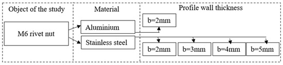 The study will differentiate between nuts made of aluminium alloy (EN AW 5052 H32) and stainless steel (AISI 303 1.4305). Aluminium nuts are 3–6 times cheaper than stainless steel nuts, but are expected to become loose at lower loads compared to stainless steel. This aspect will be addressed in the work to compare aluminium alloy and stainless steel rivet nuts. The work will also cover the four basic material thicknesses. The thickness of the base material has a significant influence on the load-carrying capacity of the rivet nut joint. Base materials of 2, 3, 4 and 5 mm thickness will be considered, which will be EN AW 6060 T66 aluminium alloy profile. Aluminium of this alloy and thickness is often used as a substructure frame or reinforcing profile for facade finishes.