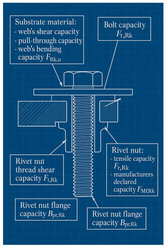 where Bpr,Rk—load-carrying capacity in shear of the rivet nut’s flange; d—internal diameter of the rivet nut’s flange; tr—thickness of the of the rivet nut’s flange; fum—ultimate tensile strength of the rivet nut; Υm,2—partial safety factor.