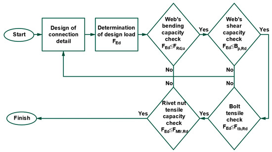 The design method, generalised in the current study, was developed based on the requirements of standards [15]. The method was supplemented by information from sources [16,17], which relate to the specific tension rivet nut connection under consideration. These sources discuss the load-bearing capacity of the thread and the buckling of the profile web. The information related to the design method for determining the tensile load-bearing capacity of a rivet nut connection with an aluminium alloy profile is summarised in Figure 5. As shown in Figure 5, the load-carrying capacity of the considered connection should be determined by considering the load capacities of the metal profile, the rivet, and the rivet’s nut. The load capacities of the thread and the buckling of the profile web should also be taken into account.