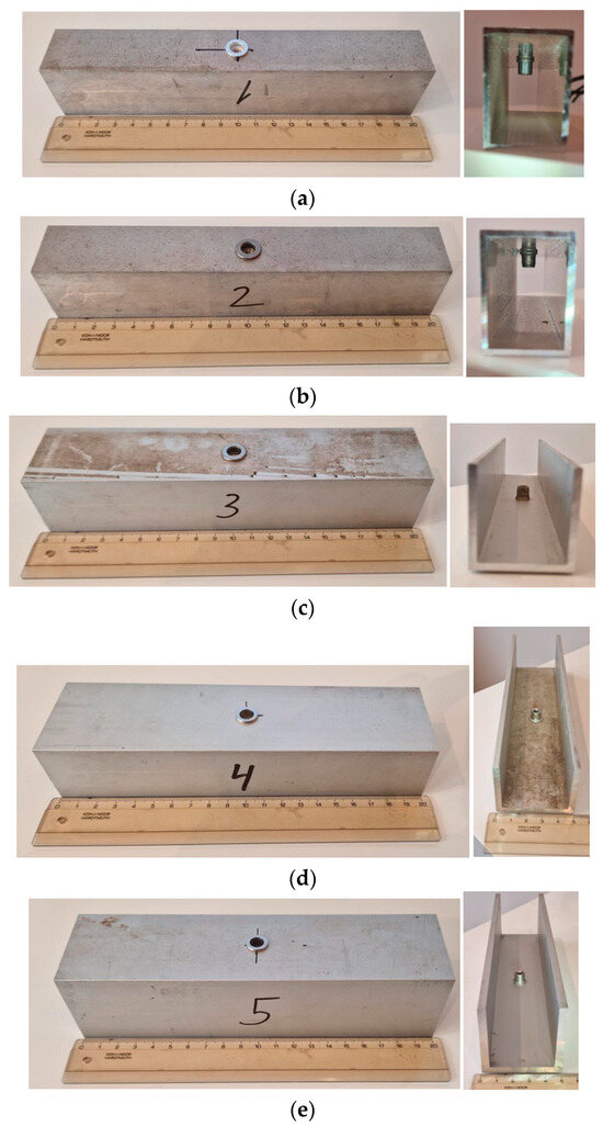 The laboratory experiment was conducted to validate the method described in Section 2.2 of the current study. Each of the five specimen groups, as mentioned in Table 1, includes five specimens. Each sample consists of a 200 mm long aluminium profile with a rivet nut and bolt positioned at the centre of the span. The specimens from all five groups are shown in Figure 7.