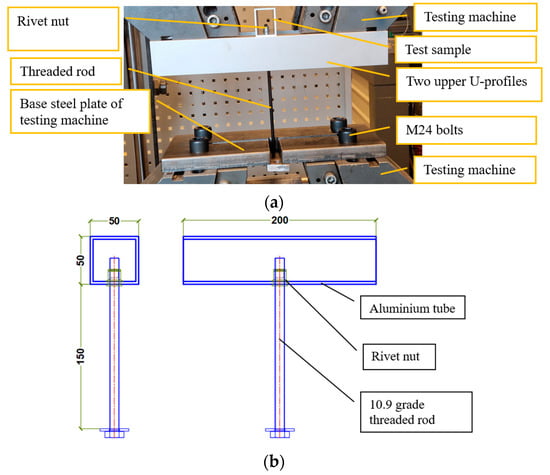 The specimens were supplemented with a 200 mm long M6 threaded rod, one end of which was screwed into the stud nut of the sample, while the other end was inserted into the bottom plate of the machine. A diagram of the specimen testing setup under laboratory conditions can be seen in Figure 8.