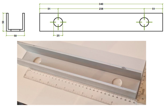 Additionally, two upper U-profiles made of aluminium alloy, which will be fixed to the machine with M24 bolts, need to be prepared. Two 50 × 50 mm aluminium alloy EN AW 6060 T66 U-profiles with a web thickness of 5 mm are used as the upper parts for the placement of the specimens in the loading machine. Figure 9 shows the required dimensions of the U-profile and the prepared details.