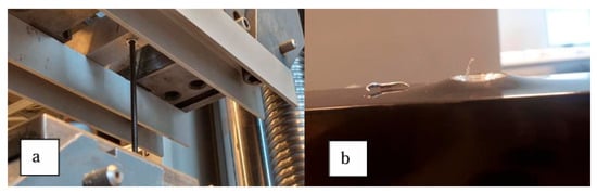 The failure of the connection occurred due to the pull-out of the rivet through the profile web. This failure mode was observed in the first four groups of specimens. The web of specimen 1.4 from the first group, after the rivet pull-out, is shown in Figure 16a. Pull-out of the rivet was not observed in the fifth group, owing to the increased web thickness of the profile up to 5 mm. The rivet’s resistance point at the profile web of specimen 5.2 is shown in Figure 16b.
