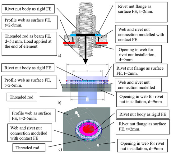 The design approaches and behaviour of rivet nut connections were investigated and described in sources [6,7,8,9]. However, none of these sources provide a method that allows for the definitive prediction of the load-carrying capacity and behaviour of rivet nut connections.