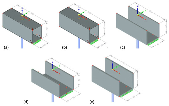 A corresponding model was developed for each group of samples. Five FEM models were created. The models mainly differed in the profile cross-section and web thickness dimensions of the samples, except for groups 1 and 2, where the difference lies in the material of the rivet flange. All specimens have a span of 100 mm. Figure 12 summarises the FEM models of the five specimen groups. All the specimen groups were described previously in Table 1.