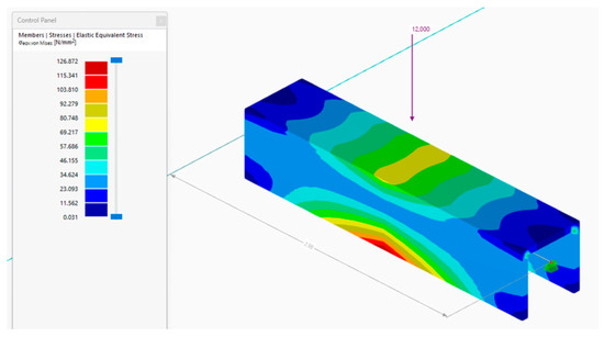 A separate FEM was developed for two 50 × 50 mm aluminium alloy EN AW 6060 T66 U-profiles with a web thickness of 5 mm. The model was used to assess the strength of the profile when loaded by a concentrated force of 12 kN, applied at the centre of the span. The maximum normal stresses acting within each U-profile were found to be 127 MPa, which is less than the design strength of the aluminium alloy EN AW 6060 T66, specified as 150 MPa. The results of the FEM analysis of the U-profiles with a web thickness of 5 mm are shown in Figure 13.