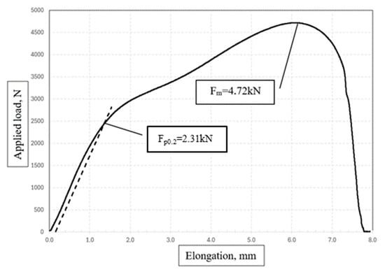 During the experimental test, the applied load and displacement diagrams showed a change in the stiffness of the connection. Additionally, the finite element analysis observed a change in slope that occurred when the rivet flange material reached its yield strength. Reaching the yield strength of the rivet flange is undesirable in order to avoid damaging the properties of the rivet. Therefore, the load-carrying capacity of the connection in the elastic stage, Fp0.2, was determined in this work and will be used for the design of the connection. The ultimate load-carrying capacity, Fm, of the specimens was also determined during the current experiment. Parameters Fp0.2 and Fm were derived from the load/elongation charts obtained for each specimen during the laboratory tests, as shown in Figure 14.