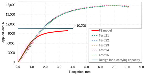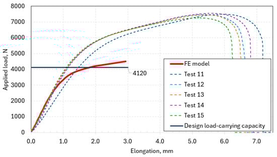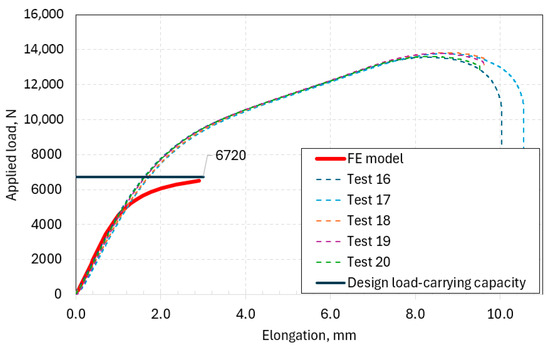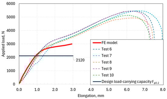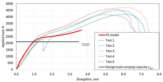 Results of the experiments, presented as load/elongation charts obtained for the first group of specimens, are shown in Figure 15 by the dotted lines. Each of the five charts in Figure 15, represented by dotted lines, corresponds to one of the five specimens in the group. The load-carrying capacity of the connection in the elastic stage, Fp0.2, for the first group of specimens varies from 2.24 to 2.40 kN. The ultimate load-carrying capacity, Fm, for the first group of specimens ranges from 4.20 to 4.72 kN. The solid red line indicates the results obtained from the developed FEM model for the first group of specimens. The horizontal blue solid line represents the load-carrying capacity Fp0.2, obtained for the first group of specimens using the proposed design method for determining the tensile load-bearing capacity of a rivet nut connection.