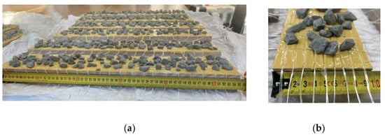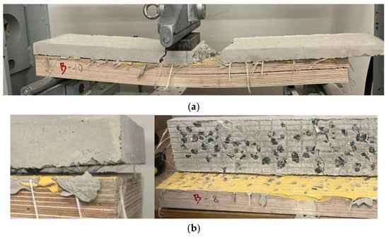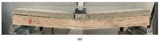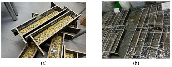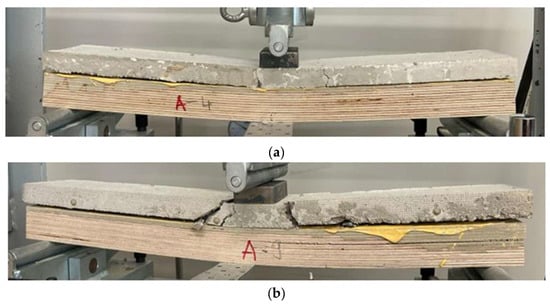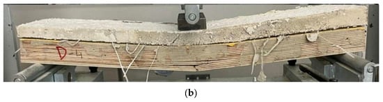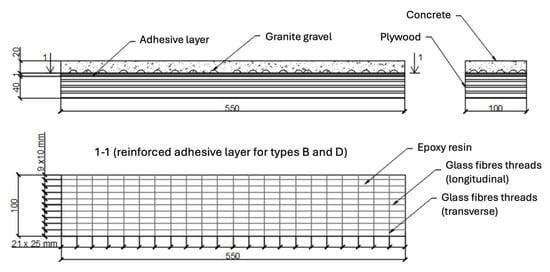 C30/37 class concrete (LVS EN 1992-1-1:2005 []) was used as the specimen’s top layer material. The modulus of elasticity and Poisson’s ratio equal 33 GPa and 0.2, respectively. Tensile and compressive strengths of the concrete are equal to 2.9 and 30 MPa, respectively. Two-component (A and B) epoxy glue XEPOX G with a modulus of elasticity and Poisson’s ratio equal to 3 GPa and 0.35 was used for plywood connection with the concrete layer. Tensile strength and strength in shear of the epoxy glue are equal to 30 and 25 MPa, correspondingly. The mixture of components A and B causes an exothermic reaction and forms a three-dimensional structure. Granite chips provided a plywood-to-concrete connection with dimensions 8–16 mm. The density of the concrete was equal to 2.4 kN/m3. The process of specimen preparation with the adhesive timber-to-concrete connection by the granite chip method was the same as in the previous investigations, described in detail in [,,].