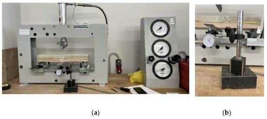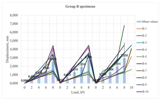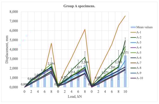 The three-point bending scheme tested all three groups of specimens using the device FORM+TEST UPB 86/200 (Figure 5). Each specimen was loaded three times to 8 kN with steps equal to 2 kN. The design value of the load-carrying capacity of A group of specimens in 8 kN was determined analytically by the macro-mechanics of layered materials and by the software “Verisim 4D”. After the first two loadings, the load was removed, but after the third loading, the load was increased until the collapse of the specimen. The maximum vertical displacements in the middle of the specimen’s span were determined at each loading stage by two mechanical indicators with a precision of 0.01 mm.