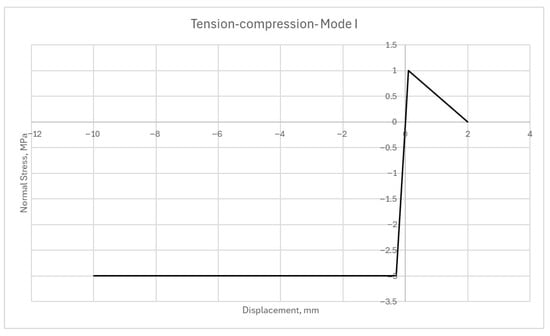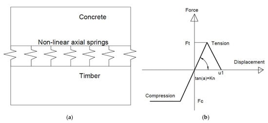 An elaborate FEM model was developed to verify the lab experiment results, using newly developed Verisim4D software []. Both concrete and timber were modelled as solid finite elements. When defining timber mechanical properties for the FEM model, the non-uniformity of this material was reflected by the multi-axial failure and plasticity in parallel and perpendicular actions to the grain. The connection zone of the FEM model was created as a non-linear cohesive zone, governed by normal and shear stress–displacement curves.