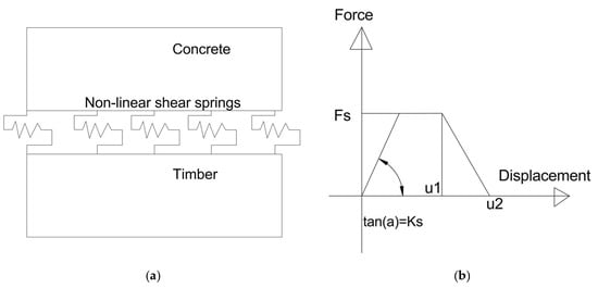 Finite element method (FEM) models created to simulate the behaviour of TCC span from relatively simple to rather intricate. The authors used ANSYS (2022 R1 Student Version) software to verify the results of previous experiments. In these models, the concrete layer was modelled as either a SOLID-type or a layer of SHELL element, and timber was modelled as BEAM or SHELL-type elements with an orthotropic material model. While the most significant challenge is the mathematical model of structural timber elements, other authors have used continuum damage mechanics to attain the projected brittle nature of the failure, also using cohesive elements to model cracking caused by connecting steel elements [,,]. Since most TCC elements in the literature are made by using mechanical connectors such as screws or dowels, the connections between concrete and timber are usually modelled as elastic spring elements, which are defined by the load–displacement curves obtained from the connectors’ slip test properties.